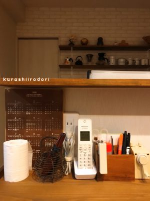 (最低限の文房具、娘のブラシ、オカメインコの糞を取るトイレットペーパー、電話の子機が置いてあります)